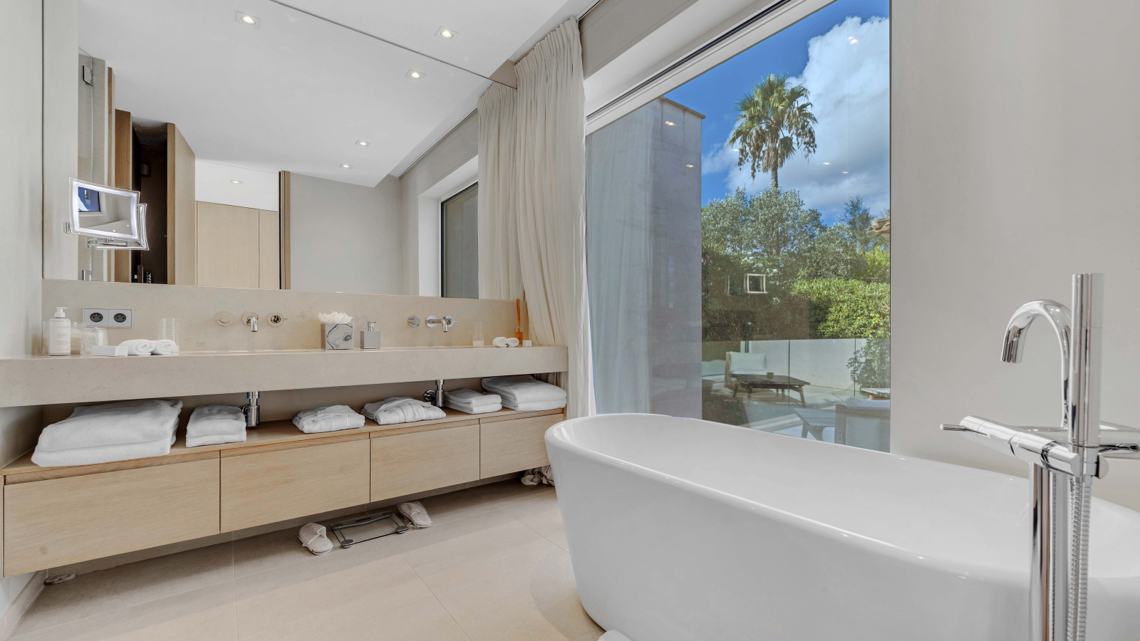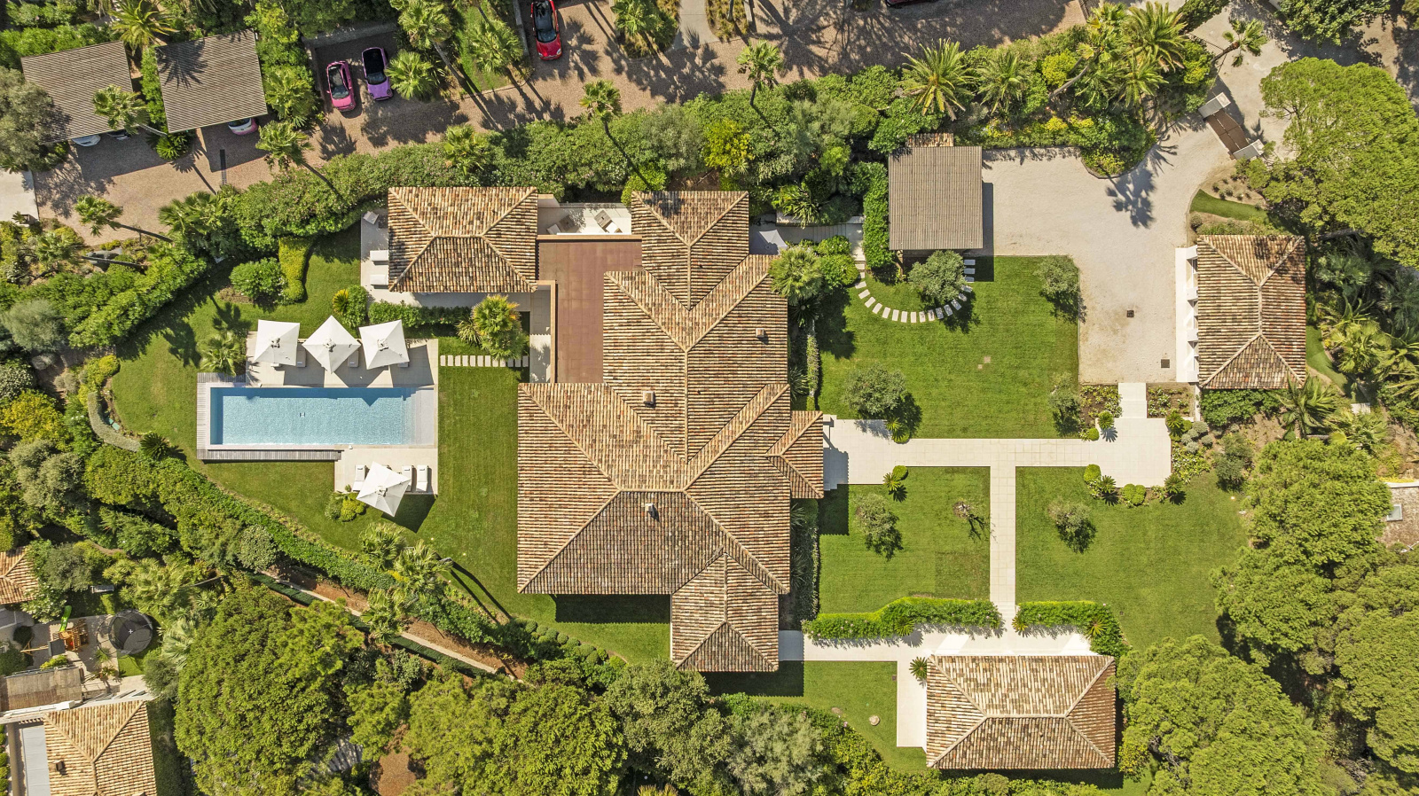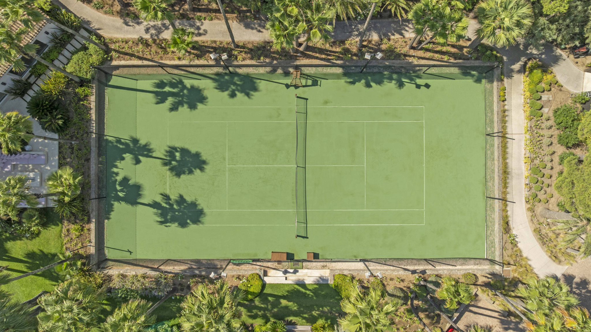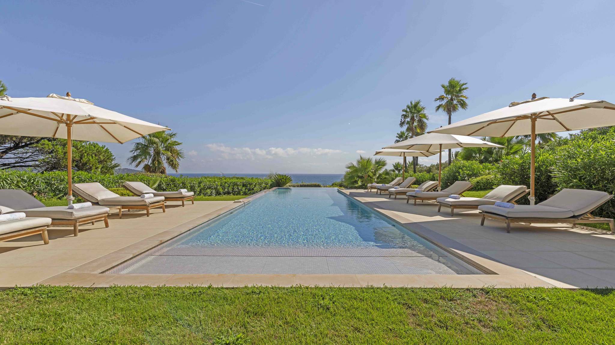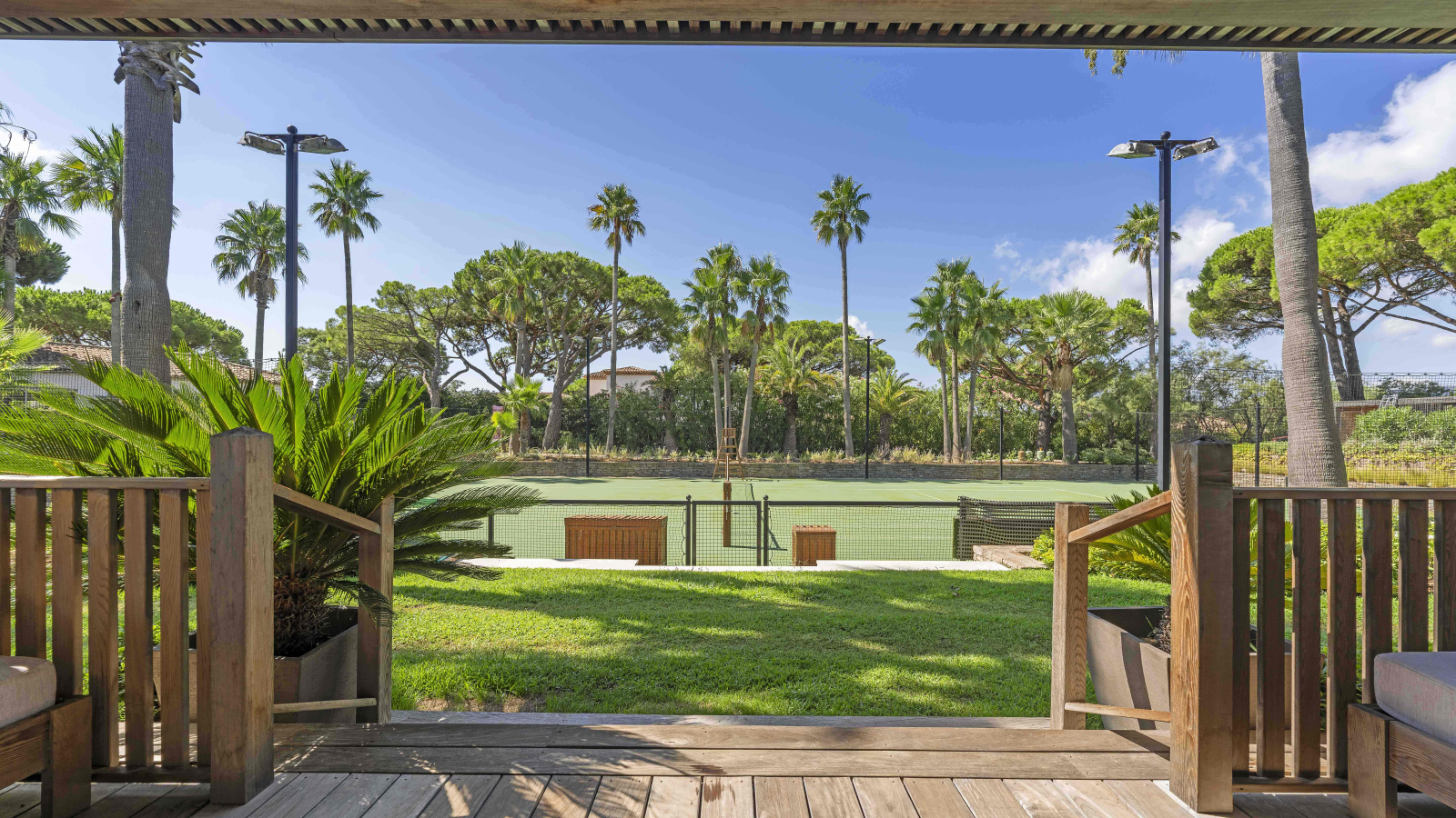 Les prestations haut de gamme incluent une piscine à débordement (4,2 x 16,4 m), un espace bien-être complet avec salle de sport, sauna, hammam et spa, ainsi qu’un court de tennis privé.