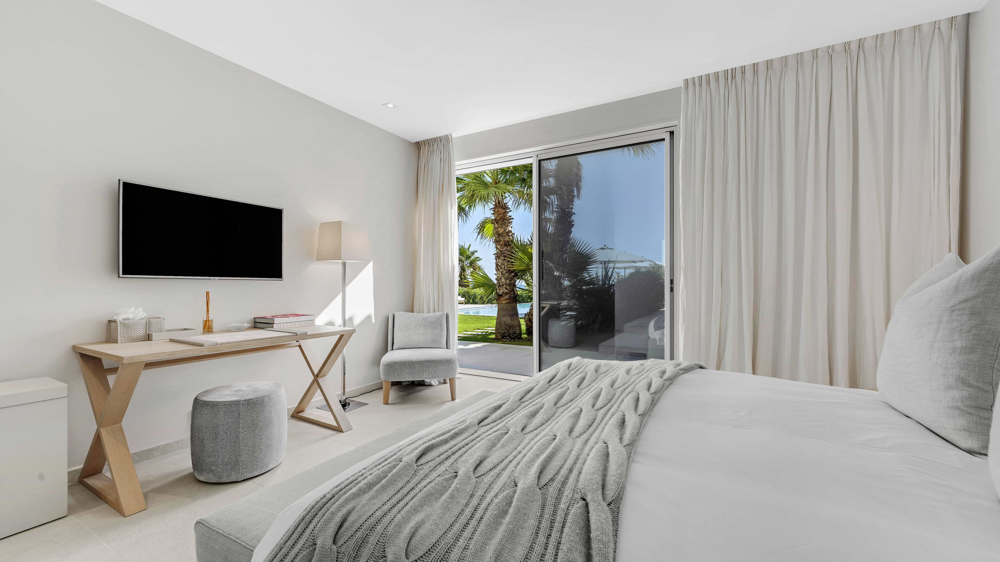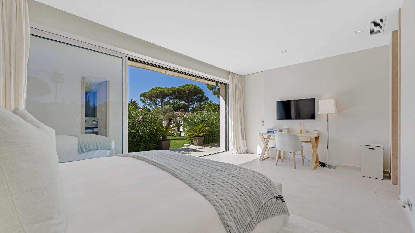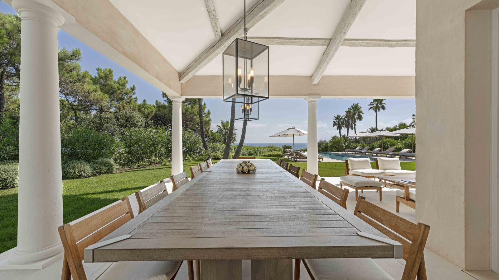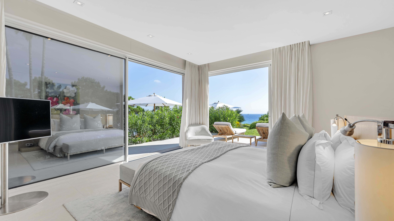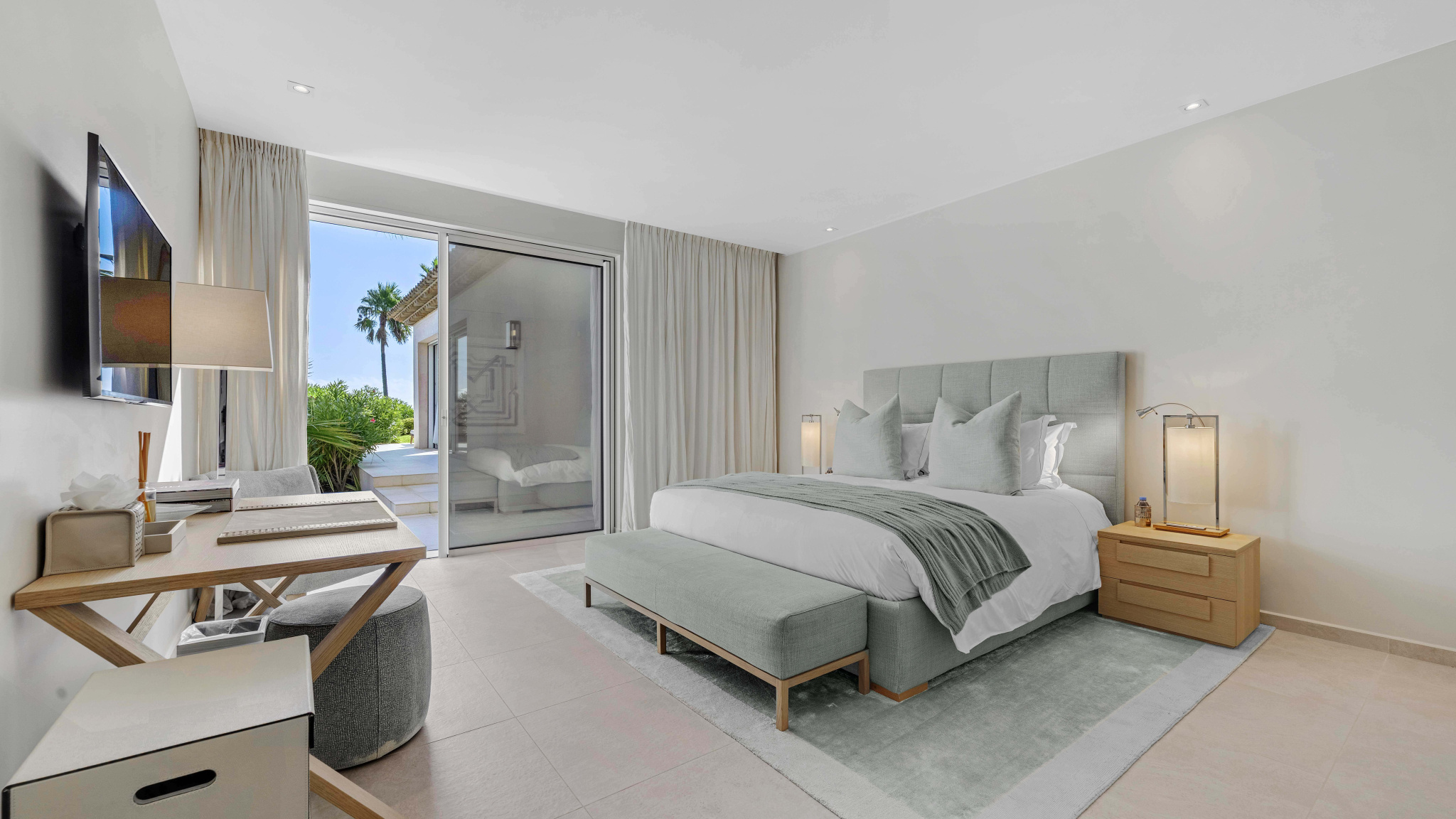 La suite principale bénéficie d’une vue imprenable sur la piscine et la mer. Quatre chambres doubles supplémentaires avec salles d’eau en suite complètent l’espace nuit principal. Une dépendance indépendante propose deux chambres supplémentaires avec leurs salles de bains.