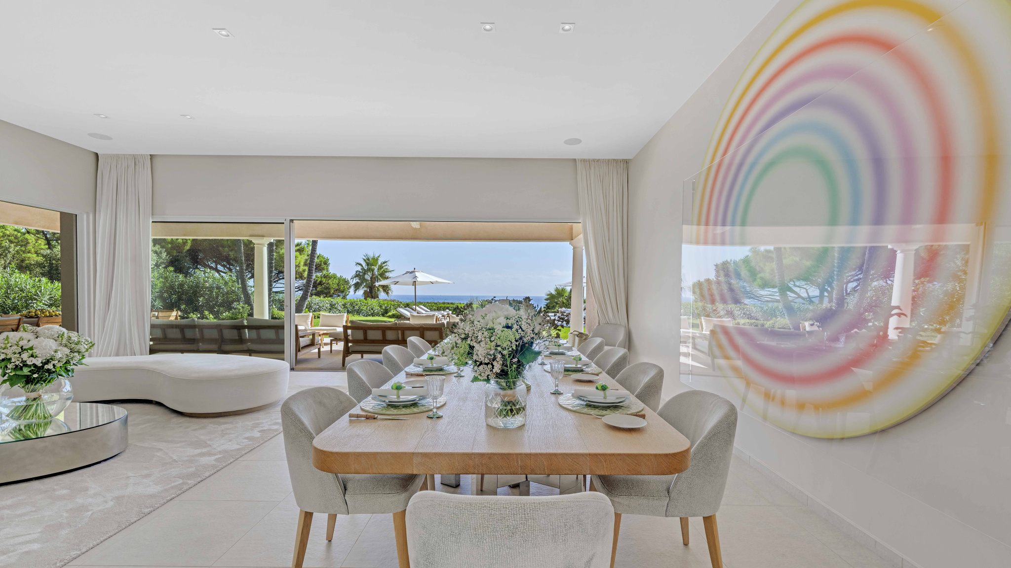 Située à seulement quelques minutes à pied des plus célèbres plages et clubs de Pampelonne, cette villa contemporaine de 650 m², édifiée en 2020 sur un terrain paysager de 4 000 m², offre un panorama exceptionnel sur la mer.